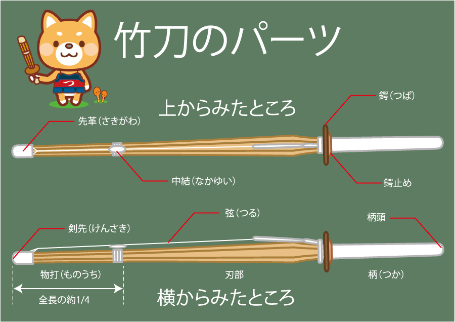 竹刀は安全に利用するためにたくさんのパーツ(部位)で構成されています。