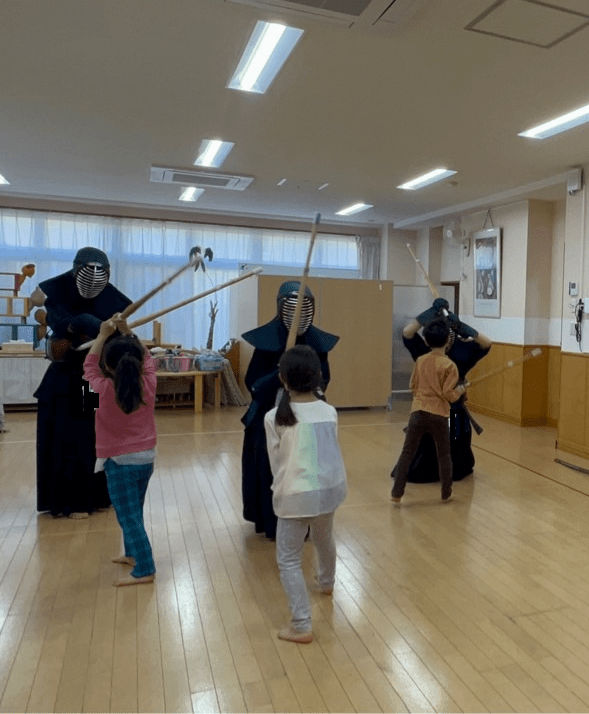 小学生3名の迫力あるお手本を見学した後に、参加園児全員が竹刀を初めて手に取って小学生の面、小手、胴を打ちながら、剣道を体験していただきました。